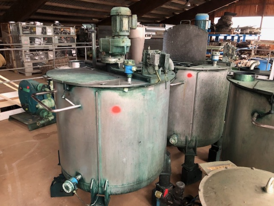 - in V2A - fahrbar - 1 m Durchmesser - 900 mm hoch - 700 l Fassungsvermögen - mit Rührwerk 0,55 kW und 99 U/Min - mit Voll- und Leermelder